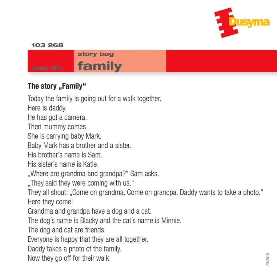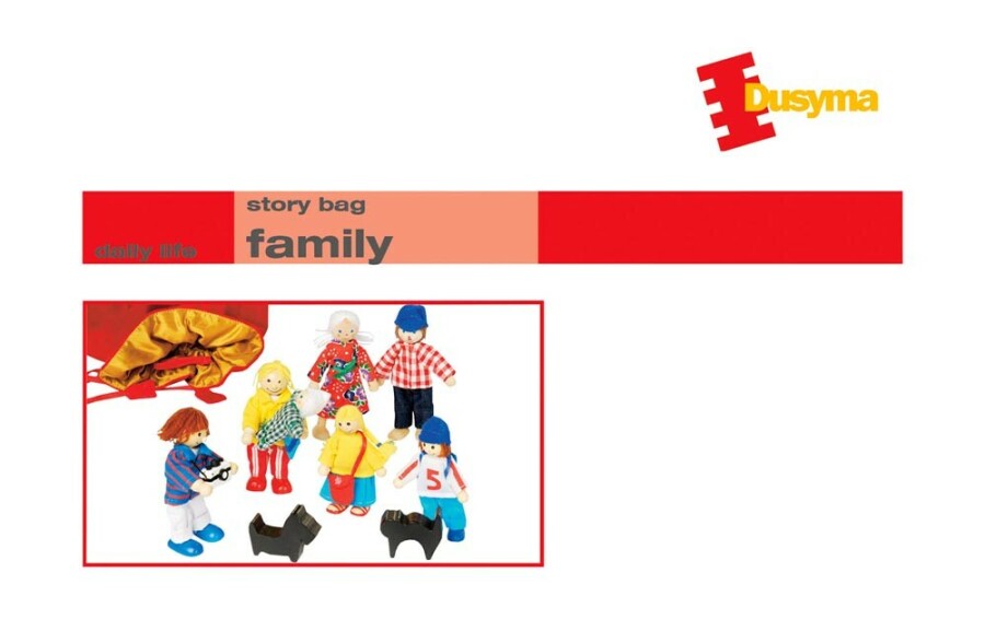 Kinderen praten en spelen over hun familie terwijl ze hun woordenschat uitbreiden. Gebruik de buidel om korte scènes na te spelen in de kring of thuis. De set bevat houten figuren van familieleden plus een hond en kat. Er zit een verhaaltje bij in het Duits en Engels. De zachte fluwelen buidel beschermt alles en is fijn om vast te houden. Begeleid het spel; er zitten kleine onderdelen in. Handwas aanbevolen.