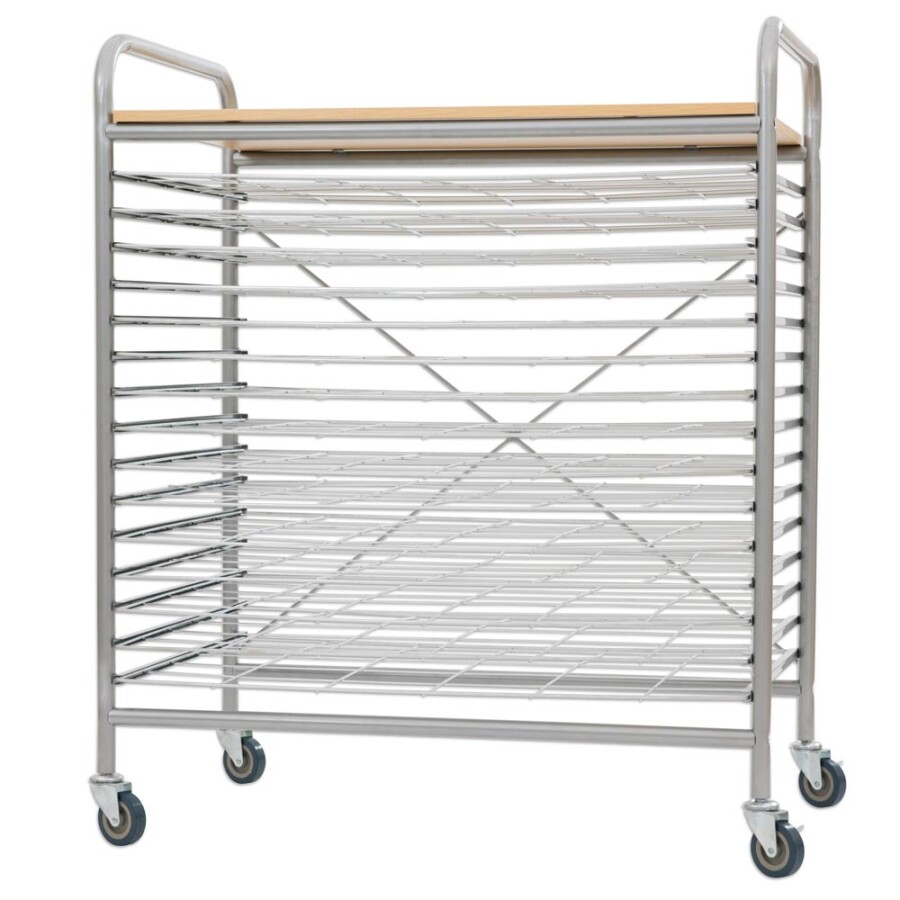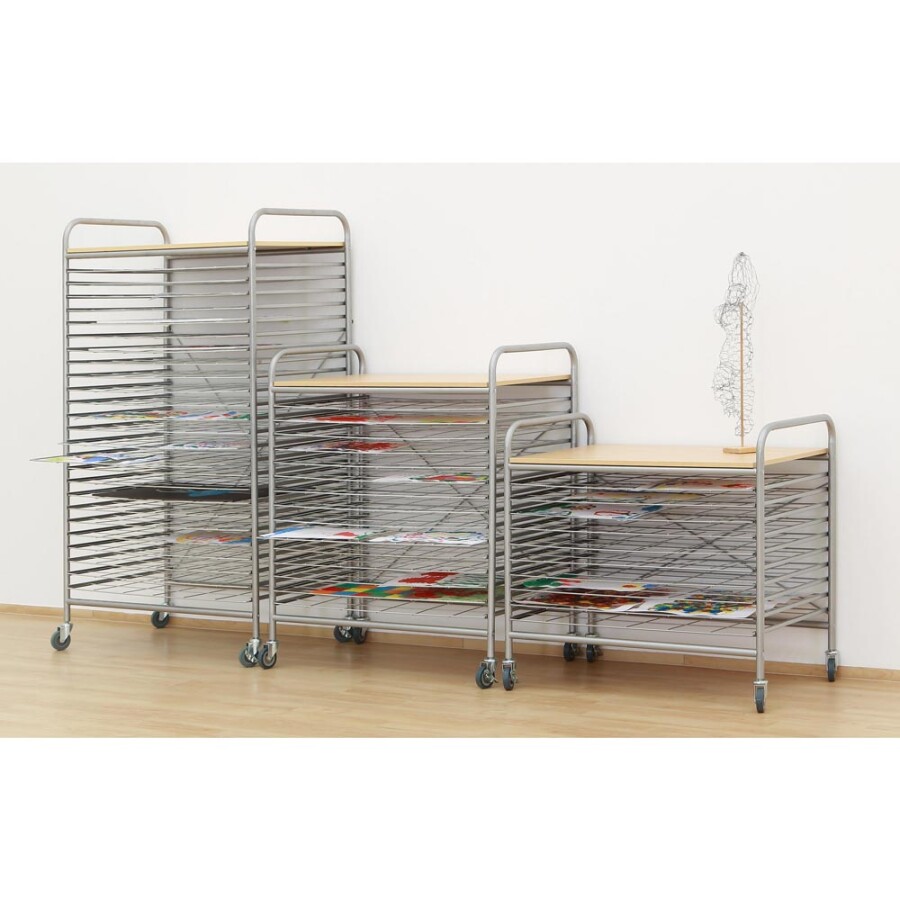 Dit verplaatsbare droogrek is ideaal voor scholen en kinderdagverblijven die veel knutselwerkjes en schilderijen willen laten drogen zonder dat ze in de weg liggen. Met 15 roosters biedt dit rek ruimte voor kunstwerken tot formaat A1. Het rek is voorzien van wieltjes, zodat je het makkelijk door de klas kunt verplaatsen. Dankzij de speciale coating roest het rek niet, zelfs niet als het nat wordt. De wieltjes zijn bovendien voorzien van een rem, zodat het rek stevig op zijn plek blijft staan.