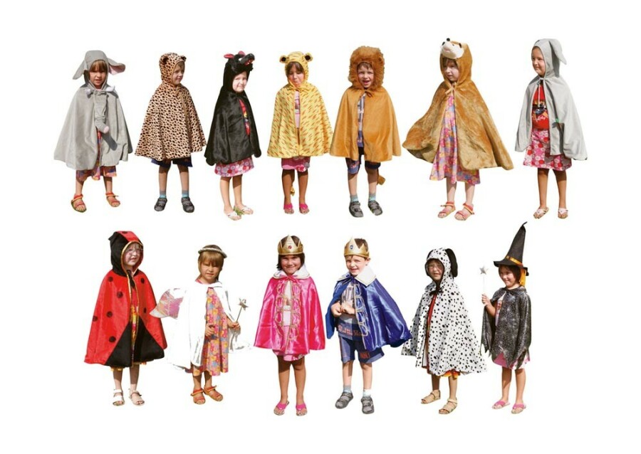 Een rijke set dieren- en sprookjeskostuums die elke speelhoek tot leven brengt. Laat kinderen veranderen in engel, koning, koningin, haas, olifant, wolf, heks, egel, dalmatiër, leeuw, lieveheersbeestje, tijger of luipaard. Ideaal voor rollenspel, themadagen en voorstellingen. Stimuleert verbeelding, samenwerking en woordenschat.