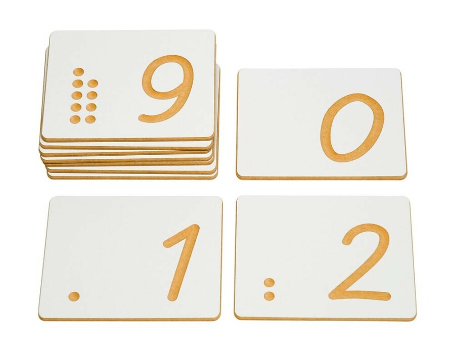 Tactiele cijferkaarten laten kinderen cijfers en hoeveelheden echt voelen. De groeven leiden vingers langs de schrijfwijze van 0 tot en met 9. Bijpassende puntjes tonen de hoeveelheid voor zelfcontrole. Ook bruikbaar met gesloten ogen voor extra concentratie.