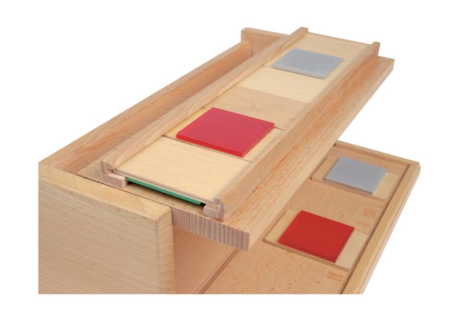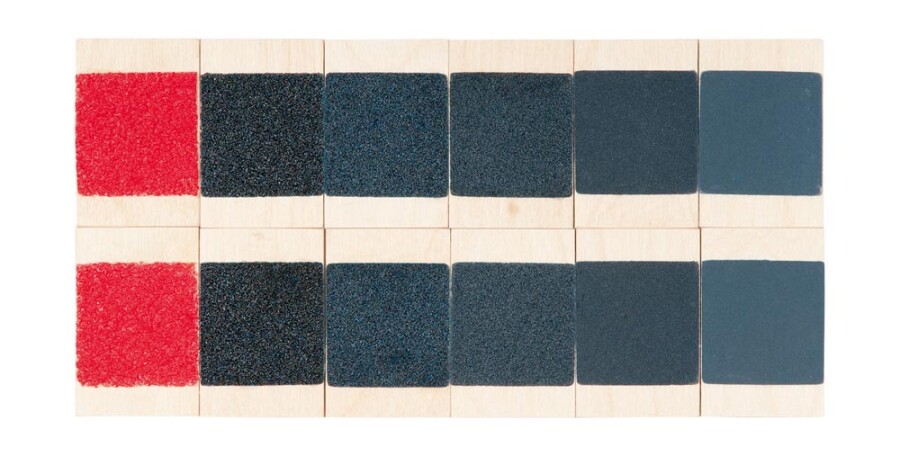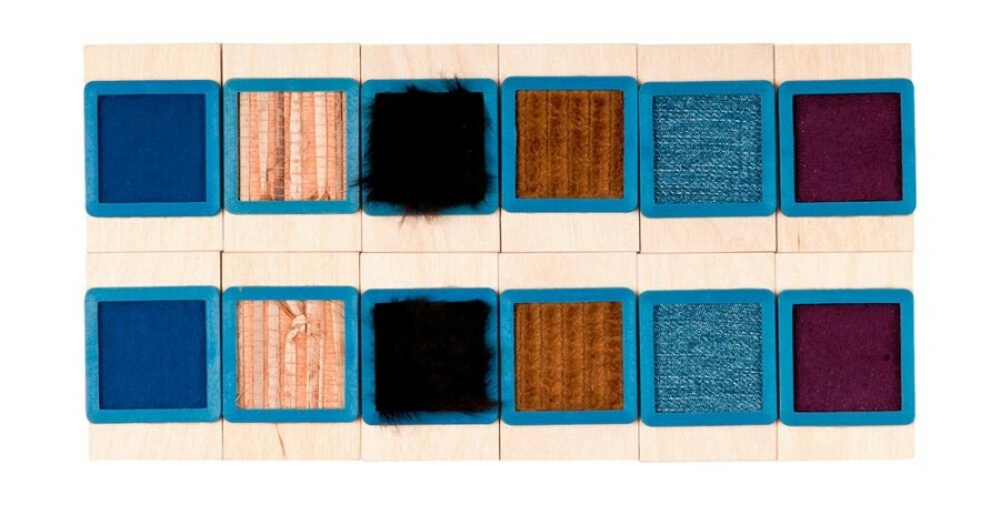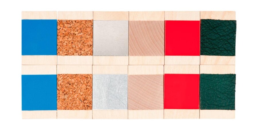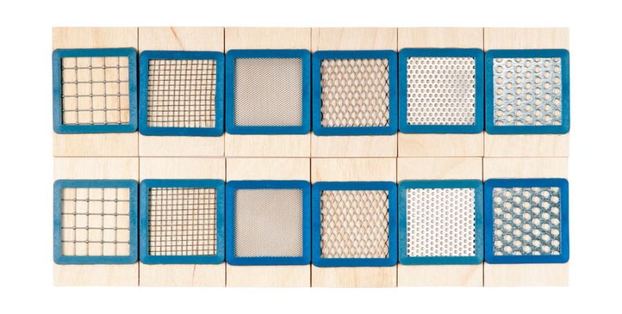 - Inhoud: 1 voelbox met 6 sets, elk 6 materiaalparen (per paar 6 x 4 cm)