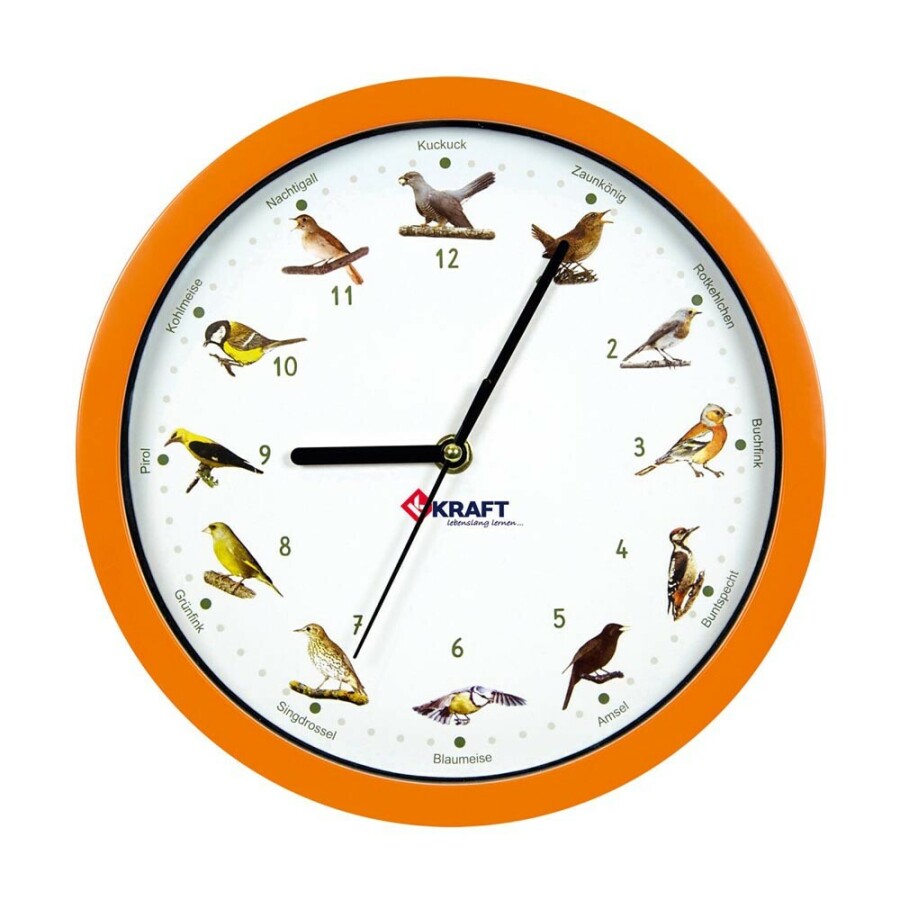 Deze muurklok brengt vrolijk vogelgezang in de klas of thuis en helpt kinderen de tijd herkennen. Elk heel uur klinkt één van twaalf Nederlandse zangvogels, met naam en afbeelding op de wijzerplaat. Dankzij de nachtstand is de klok stil tussen 22.00 en 07.00 uur. Het quartz uurwerk loopt nauwkeurig en werkt op batterijen. Geluid en tijd lopen op aparte batterijen, dus uitzetten kan altijd.