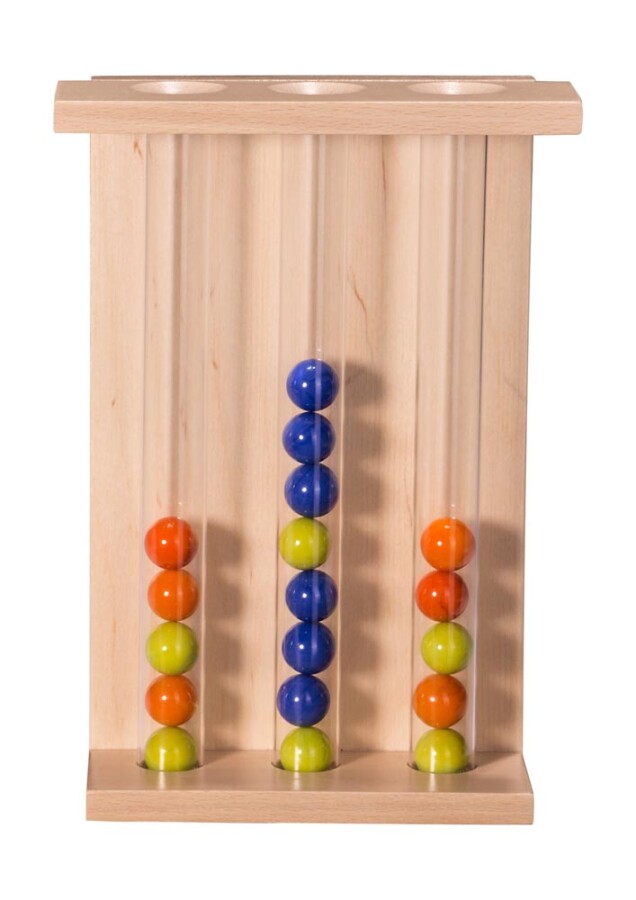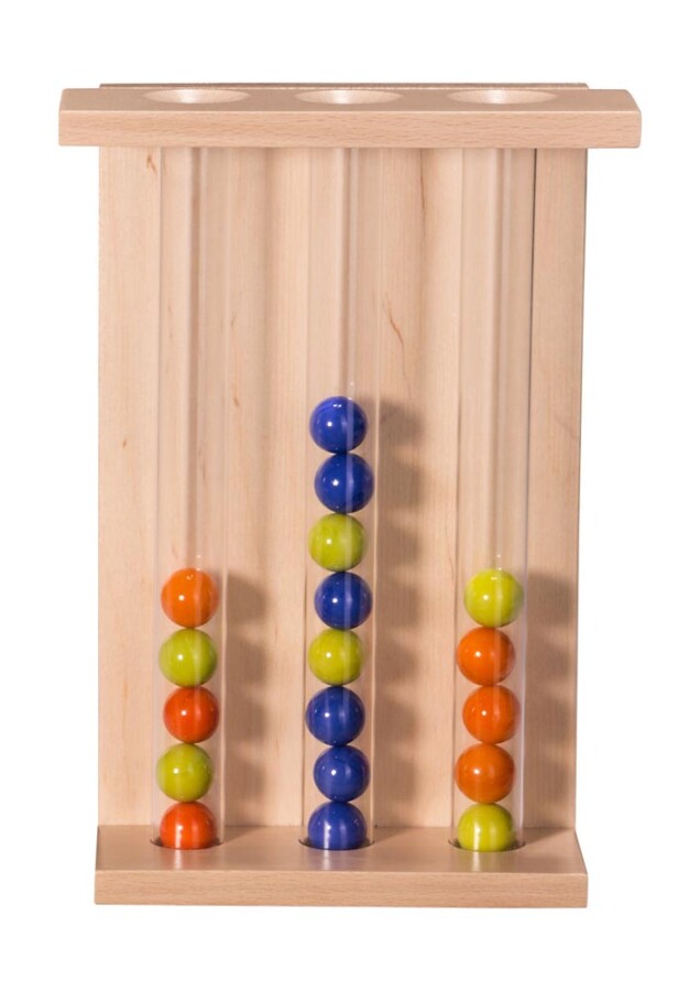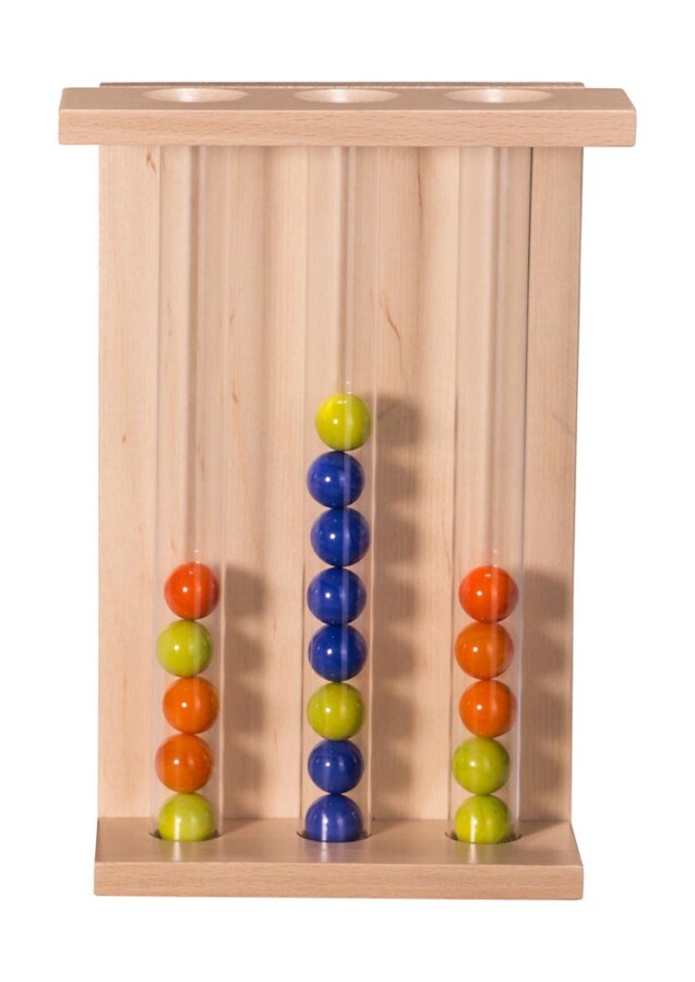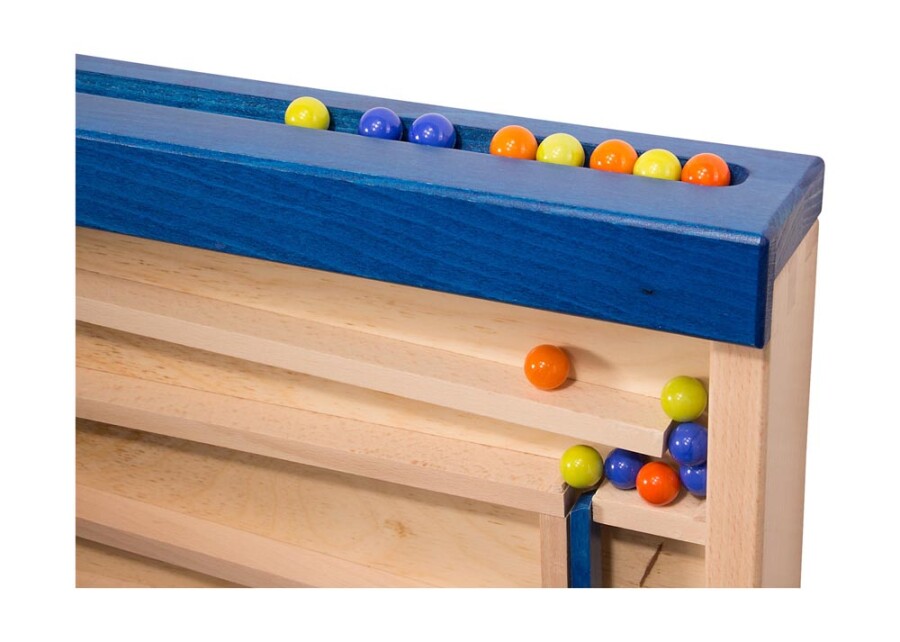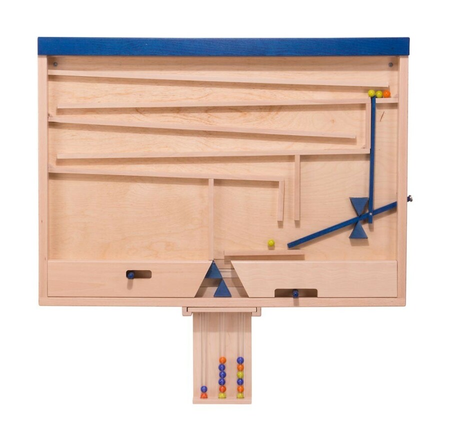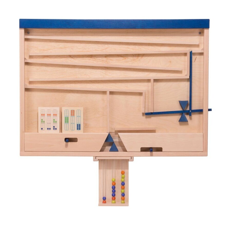 Dit wandspel laat kinderen knikkers sturen, sorteren en tellen. Schuivers en buizen maken oorzaak en gevolg zichtbaar. De opdrachtkaarten bieden variatie van makkelijk tot lastig. Ideaal voor samen spelen én zelfstandig oefenen. Stevig en aantrekkelijk voor groep en hal.