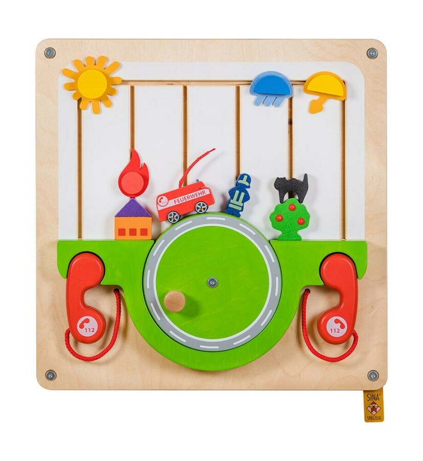 Op de muur wordt iedere reddingsactie levensecht nagespeeld, van alarm tot hulp ter plaatse. Kinderen bellen het noodnummer, draaien aan de grote slinger en sturen de brandweer. Duurzaam paneel met bewegende delen dat uitnodigt tot rollenspel en samenwerken. Montage en bevestiging zijn eenvoudig met de meegeleverde set.