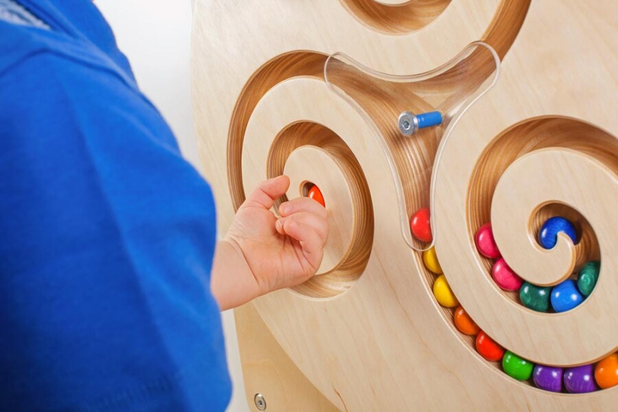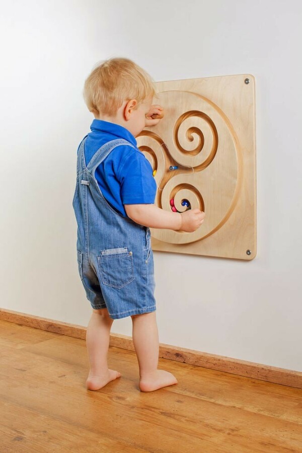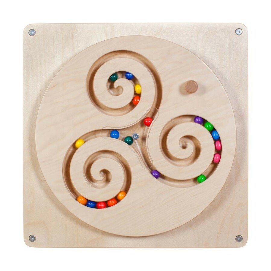 Een stevig wandspel voor in de klas of thuis, ideaal om motoriek en concentratie te oefenen. Aan het handvat draai je de schijf, waardoor de gekleurde houten kogels in een gesloten kring rondwervelen. De kogels blijven binnen het spel en zijn niet uitneembaar. Kinderen kunnen de kogels ook met hun vingers verplaatsen, wat oog-handcoördinatie en visuele volgvaardigheid bevordert. Het bord is gemaakt van multiplex en acrylglas, de hendel van berkenmultiplex; duurzaam en veilig. Wordt geleverd met montagemateriaal en een duidelijke instructie, en past eenvoudig aan de muur.