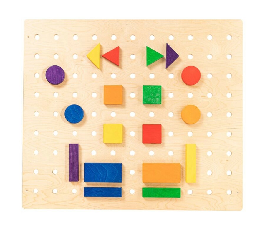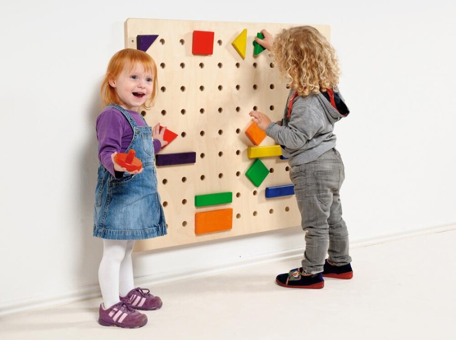 Dit wandbord trekt kleine onderzoekers aan met grote, kleurrijke steekvormen. Kinderen plaatsen de vormen steeds anders en oefenen kleur, vorm en motoriek. De onderdelen klikken eenvoudig vast, en blijven netjes aan de muur. Inclusief bord en achttien stekers in zes geometrische vormen. Het paneel is 97 x 80 x 1,2 centimeter en wordt met montage-instructie geleverd.