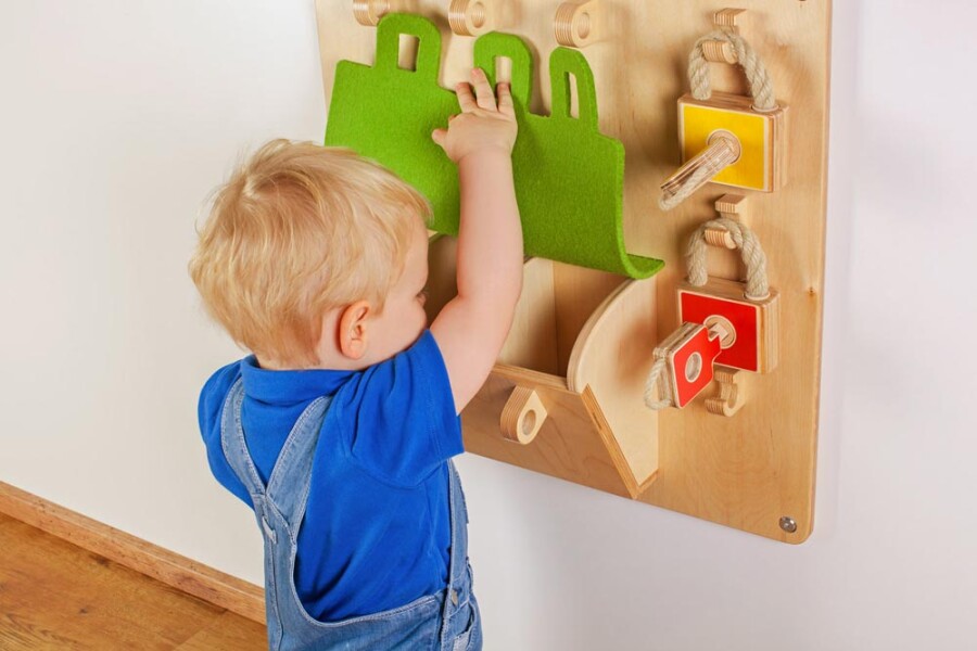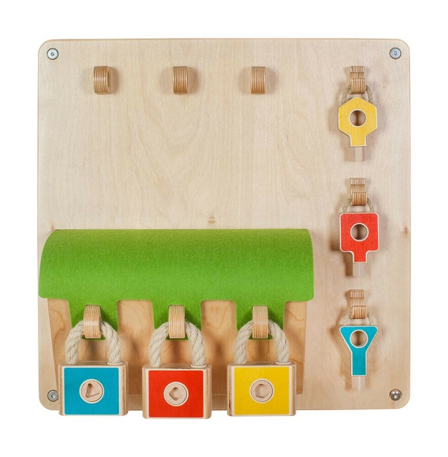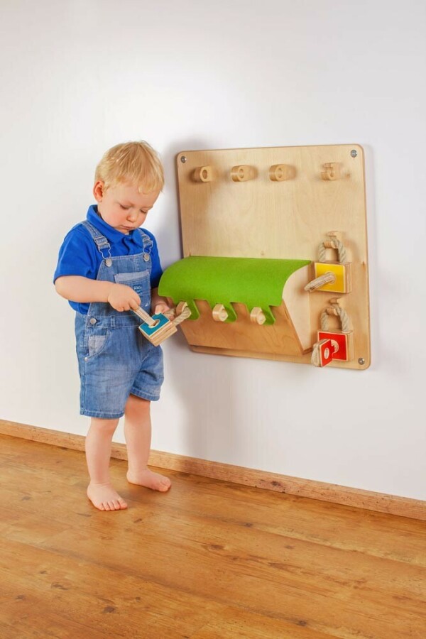 Een stevig speelbord voor aan de muur met ingebouwde schatkist en drie verschillende sloten, speciaal voor kleuters en jonge kinderen. Alleen met de bijpassende sleutel gaat elk slot open, zodat kinderen spelenderwijs probleemoplossend denken en fijne motoriek oefenen. De sleutels zijn van multiplex, de sloten compact en stevig, en de deksel is gemaakt van wolvilt. Het bord is eenvoudig te monteren; montagemateriaal en een duidelijke handleiding zitten erbij. Breedte en lengte zijn beide 48 centimeter, de hoogte is 16 centimeter, handig voor groeps- en thuisgebruik.