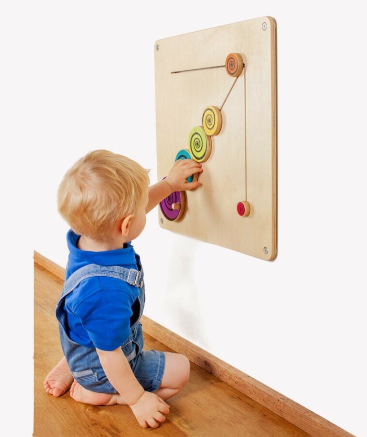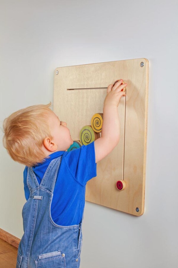 Een stevig wandspel voor in de klas of thuis dat kinderen uitnodigt om te draaien, schuiven en sorteren. Zes losse houten schijven bewegen over groeven en geven mooie optische effecten bij draaien. Een paarse schijf zet de andere schijven in rotatie als je hem draait. Kinderen oefenen vingerkracht, concentratie en logisch denken tijdens het spelen. De schijven kunnen ook met de hand langs de gleuven worden geschoven om te sorteren. Gemaakt van multiplex en geschikt voor gebruik in de klas en thuis. Wordt geleverd met montagemateriaal en duidelijke instructie.