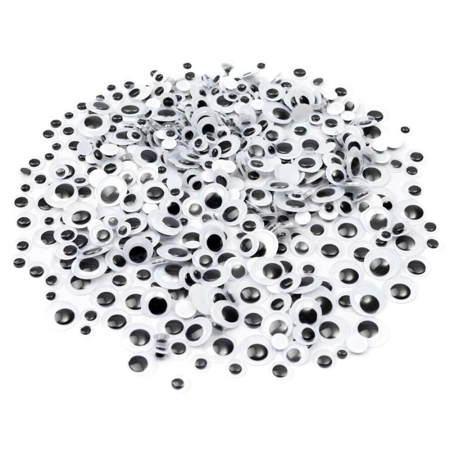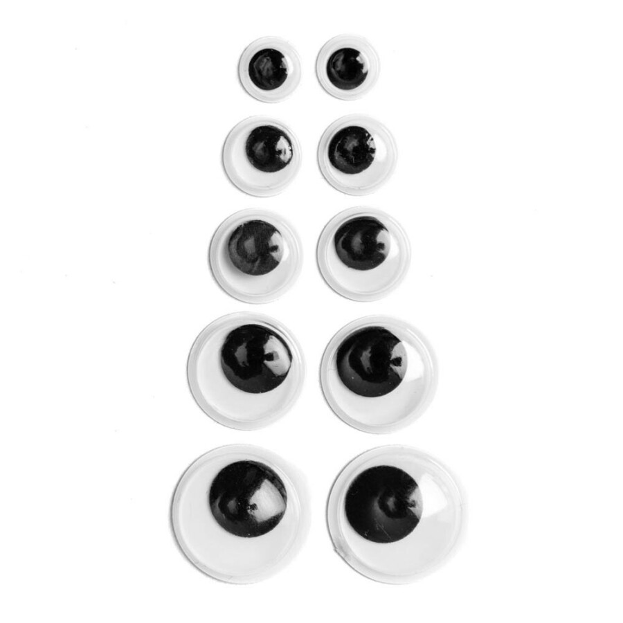 Met 500 zwartâ€witte wiebelogen in vijf maten vind je altijd het juiste formaat voor je project. De pupil beweegt mee en geeft poppen, dieren en kaarten direct leven. De vlakke achterkant hecht goed met knutsellijm of een lijmpistool. Sterk kunststof kan tegen een stootje en is geschikt voor klasgebruik.