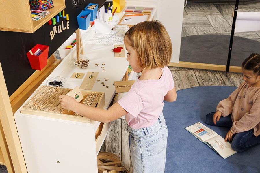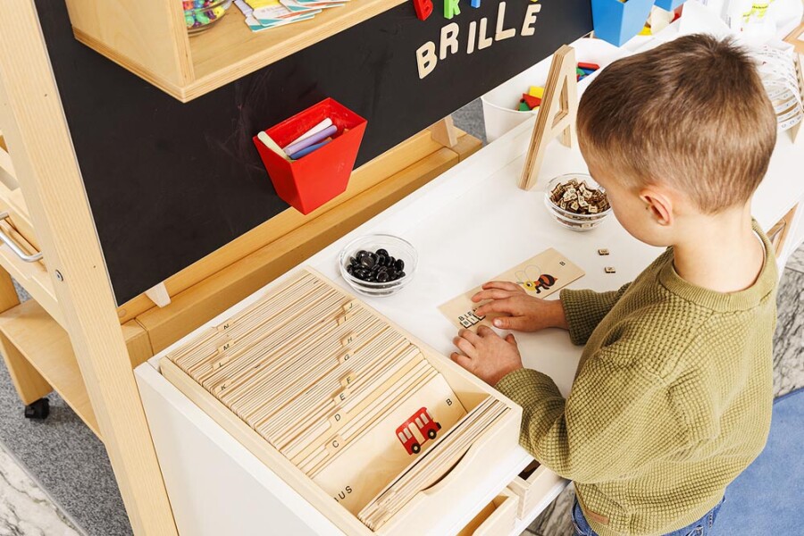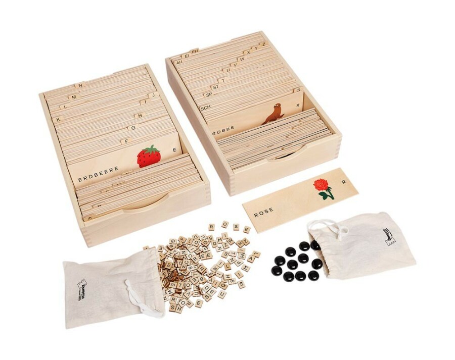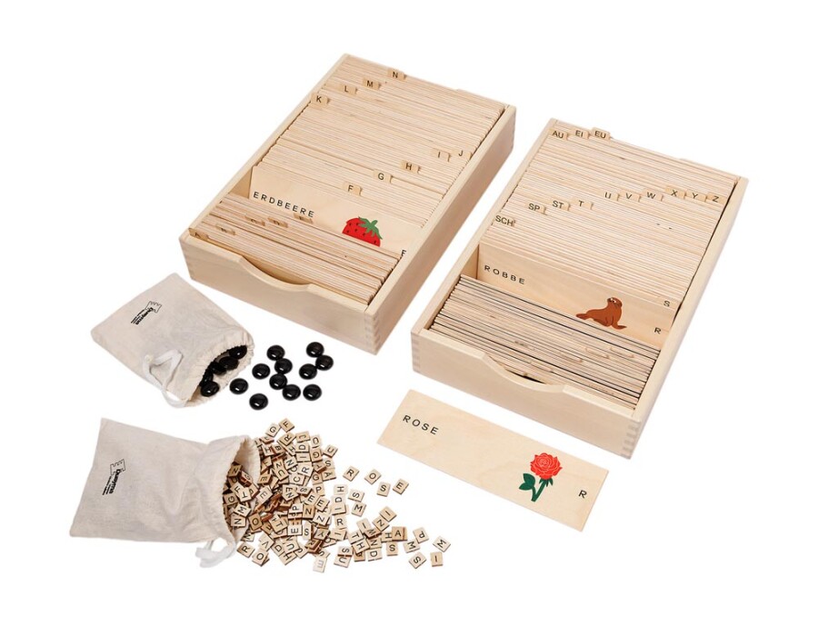 Rijk gevuld materiaal om Duits op een speelse manier aan te leren en te lezen. Kaarten tonen een afbeelding, het woordbeeld en het aantal lettergrepen. Registerkaarten met beginletters helpen bij sorteren en klankbewustzijn. Met lettertegeljes en lettergreepstenen leg je snel de eerste woorden. Twee stevige dozen houden alles overzichtelijk en compleet.