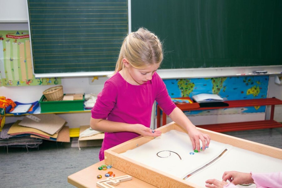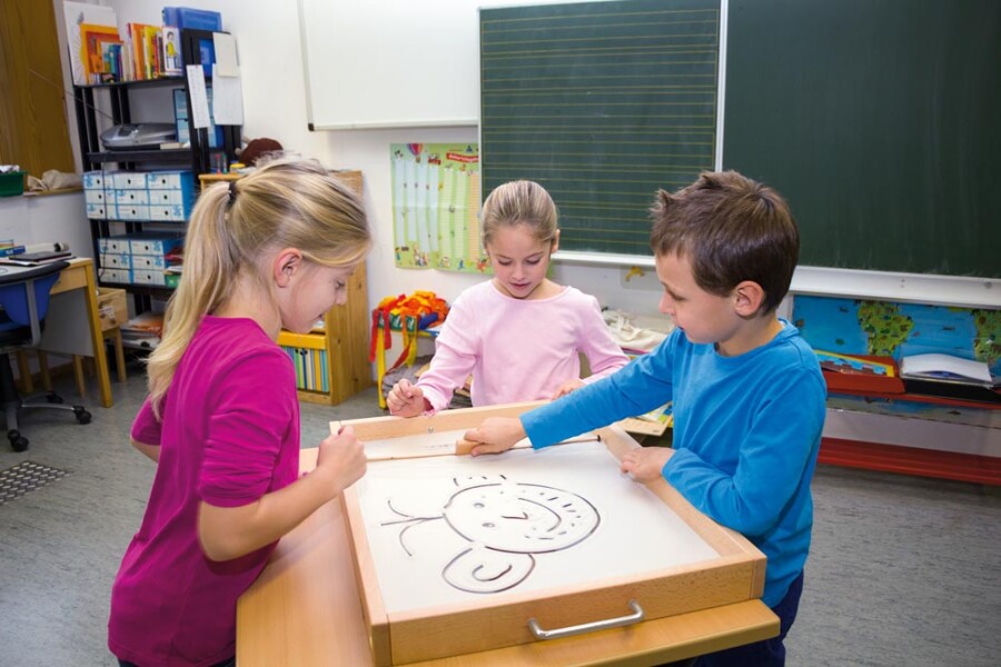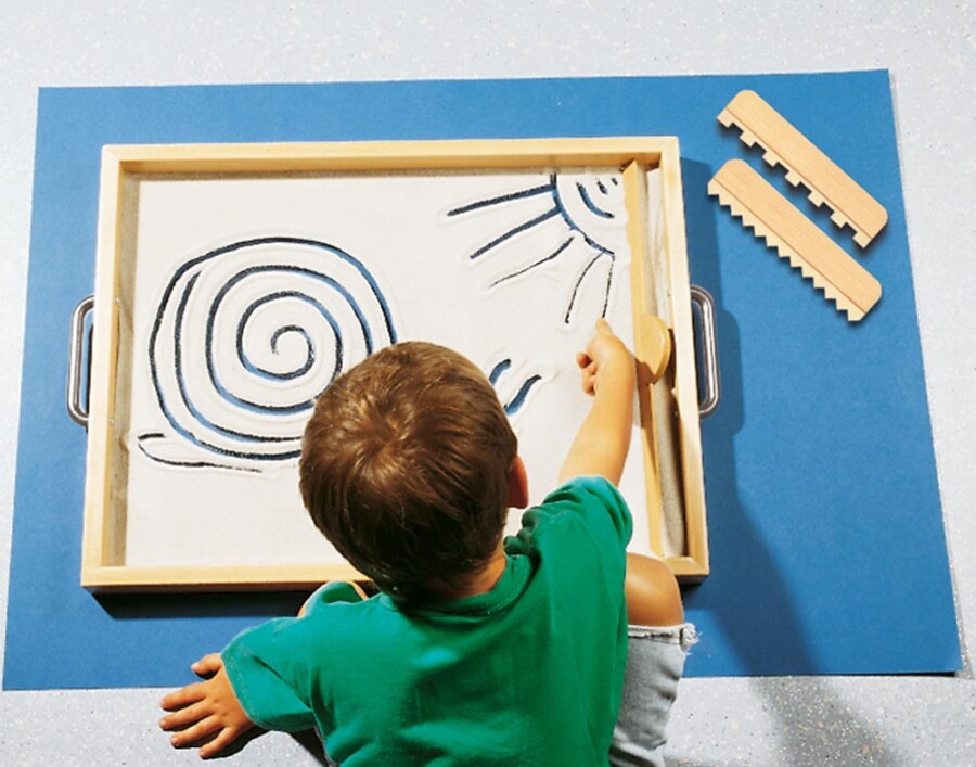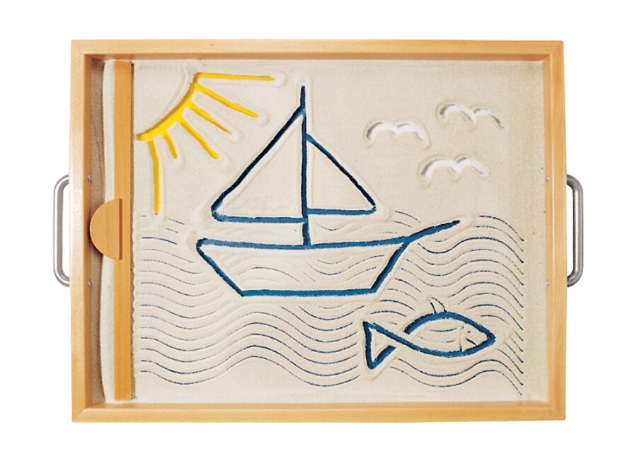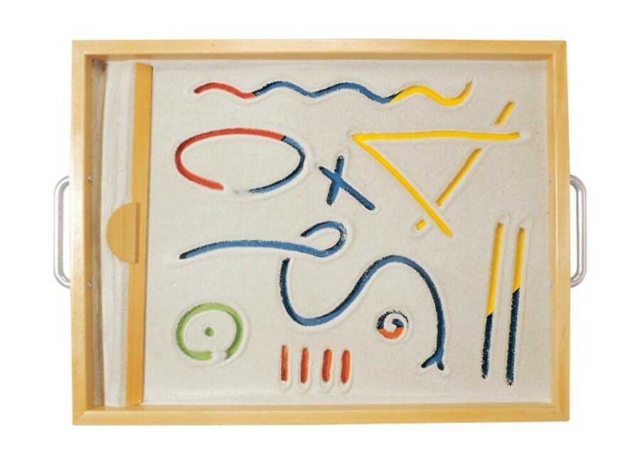 Handige zandwanne van 65 x 50 cm die een compacte, veilige speelplek biedt voor klaslokaal of thuis. De bodem is van helder veiligheidsglas; onder het glas kun je kleurpapier of zelfgemaakte tekeningen schuiven. Kinderen schrijven en trekken sporen met vingers, harkjes of stokjes; zo ontstaan mooie patronen. Met de meegeleverde sandschraper maakt een kind eenvoudig een vlakke zandplaat, klaar voor nieuwe ideeën. Als het zand verplaatst wordt, komt de kleur van het onderliggende papier mooi tevoorschijn. Door het lage profiel blijft de bak overzichtelijk en gemakkelijk mee te nemen. Zet de zandwanne op een groot doek om strooiend zand op te vangen. De set is kant-en-klaar geleverd met handgrepen, twee harkjes, sandschraper en ongeveer 1 kg fijn kwartszand.
