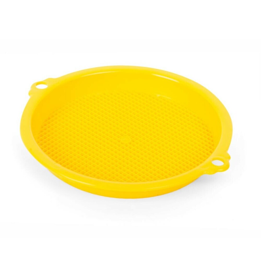 Deze gele zeef is een simpel, sterk hulpmiddel voor zandbak en natuurhoek. Kinderen zeven schelpen, stenen of bladeren en oefenen motoriek. Het formaat ligt prettig in kleine handen. Handig voor spelen, onderzoeken en bouwen.