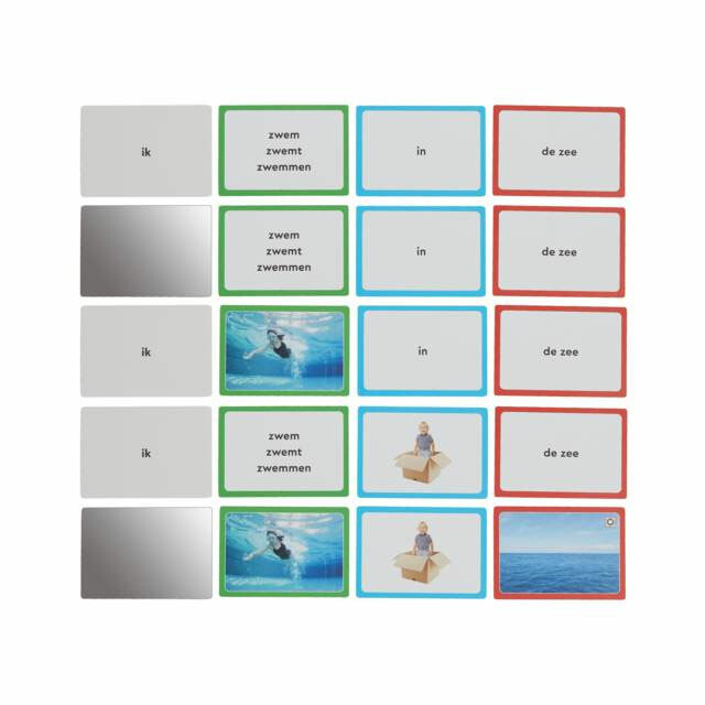Totaal 205 kaarten, elke kaart heeft op de voorkant een foto (of spiegel) en op de achterkant het betreffende woord of vervoeging van het werkwoord.