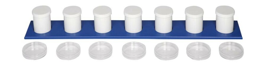 - 7 kunststof potjes met dubbel deksel (Ø 5 cm, 7 cm hoog)